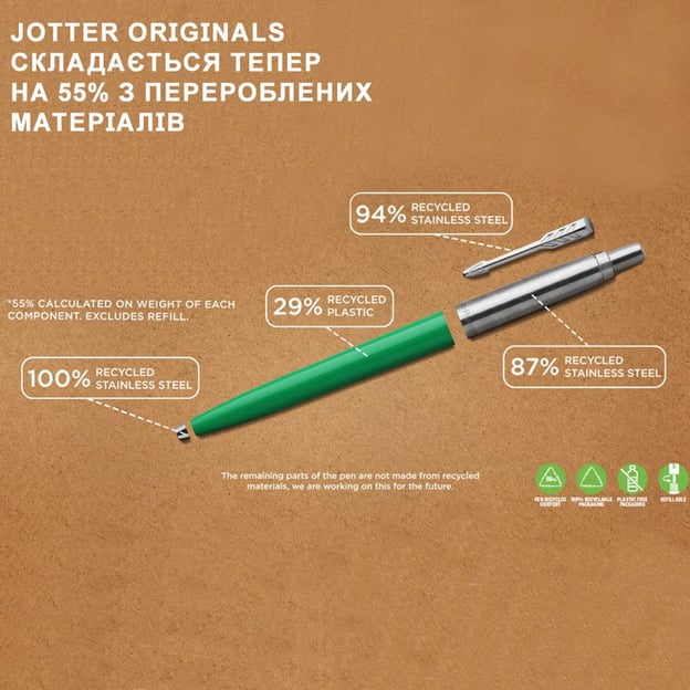 Ручка виготовлена на 55% із перероблених матеріалів, таким чином Parker прагне вкотре привернути увагу до теми раціонального використання ресурсів. Гладкий пластиковий корпус доповнено сталевим ковпачком та хромованим сталевим наконечником, щоб захистити ручку від поломок. Jotter - це компактна та легка ручка для активного використання та комфортного письма з безперебійними лініями. А палітра кольорів JOTTER Originals дозволяє підібрати ручку під ваш стиль та настрій.