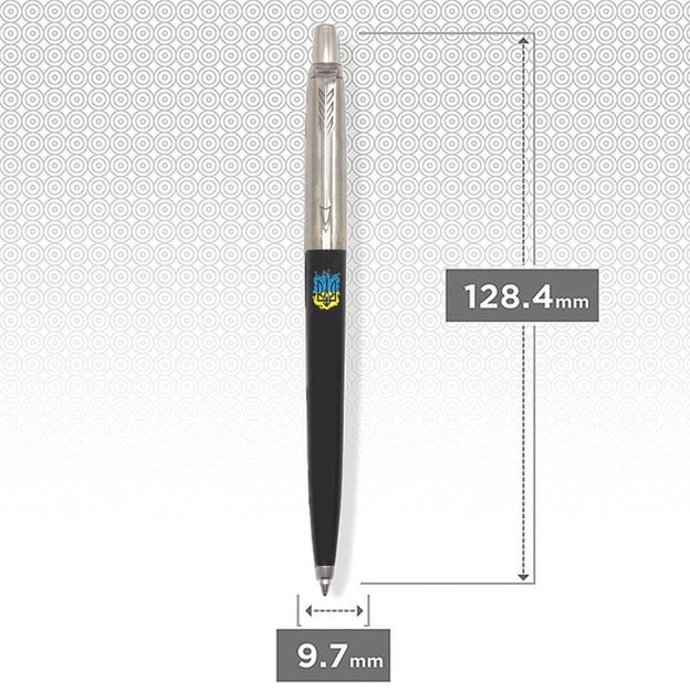 Кулькова ручка Parker JOTTER UKRAINE Originals Black CT у чорному пластиковому дизайні з якісним кольоровим друком на корпусі Вогняний Тризуб. Оригінальна ручка Parker з персоналізацією українськими символами - гарна ідея для знакового подарунка собі, партнерам, друзям.