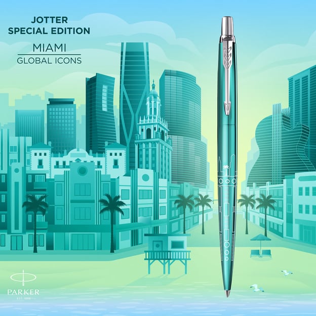 Parker JOTTER Special Edition 2025 - Miami Turquoise CT - кулькова ручка з колекції Jotter Global Icons, присвячена Маямі. Спеціальний випуск, натхненний містами у всьому світі. Цей квартет (Париж, Лондон, Сеул, Маямі) став другим для Global Icons і готовий поповнити вашу колекцію унікальних письмових інструментів із душею. Модель Parker 19 032_MIA (2221602) натхненна яскравими будинками в стилі ар-деко, сміливими геометричними формами, які визначають барвисту, грайливу сутність міста. Дизайн натхненний культовими фасадами Оушен Драйв та химерними деталями, що відображають веселий, живий дух Маамі, з елементами його відмінних споруд, що охоплюють корпус ручки.