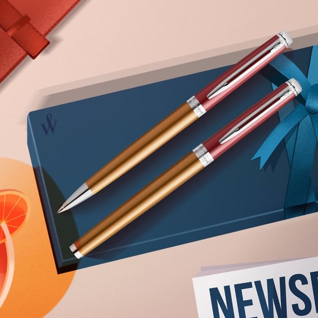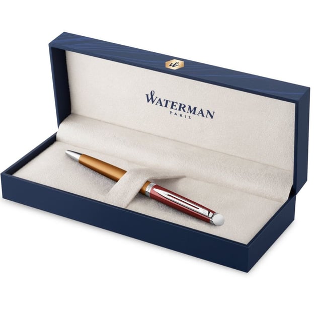 Помаранчевий двотоновий корпус із паладієвим оздобленням виглядає яскраво й водночас елегантно. Класичні риси колекції – ковпачок зі скошеним торцем, гравіювання з назвою бренду та країною походження на кільці, а також логотип Waterman на затискачі – додають виробу впізнаваності та престижу. Вузький затискач у поєднанні з широким кільцем підкреслюють тонкий силует і сучасний характер ручки.