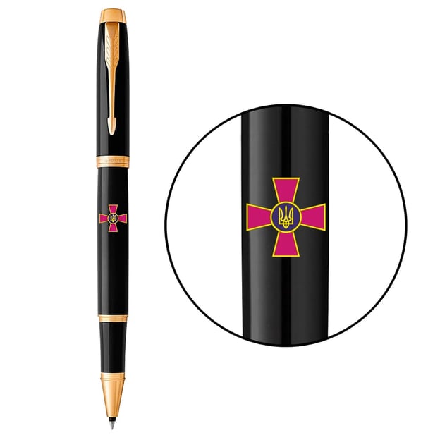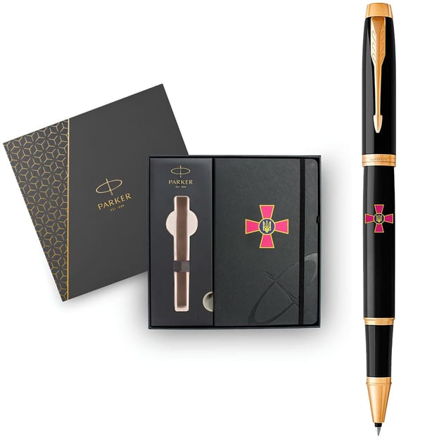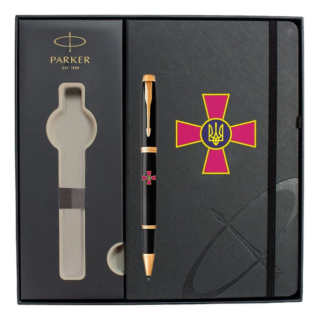 Подарунковий набір Parker 22022b24_W0010u з ексклюзивної колекції IM ARMY Емблема ЗСУ: ручка-ролер та блокнот, доповнені емблемою ЗСУ. Завдяки унікальному дизайну з якісно виконаним друком стане знаковим презентом усім захисникам України. Підійде для чоловіків та жінок, а ролерний тип письма – чудовий варіант ручки для підпису.