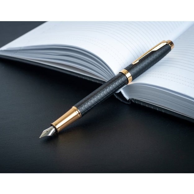 Перова ручка Parker IM Premium Black GT у преміальному дизайні з чорним матовим покриттям, різьбленим візерунком і тонким сталевим пером.