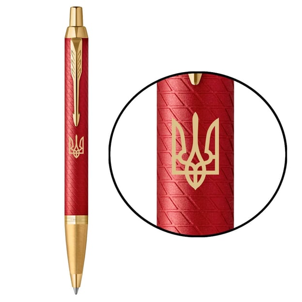 Parker IM Premium UKRAINE Red GT Red BP — преміальна кулькова ручка в яскраво-червоному дизайні з вишуканими позолоченими елементами. Унікальна модель, створена в рамках колекції IM Ukraine, символізує гордість і відданість українським цінностям. Корпус ручки з латуні прикрашений гравіюванням Герба України (Тризубом), який гармонійно доповнює матове покриття та золотисті акценти. Завдяки збалансованій конструкції, ручка ідеально лягає в руку, забезпечуючи комфорт під час письма лівшам і правшам. Фірмові елементи, такі як вигравіруваний логотип Parker і кліп у формі стріли, підкреслюють статус і якість виробу. Ручка заправляється змінними кульковими та гелевими стрижнями.
