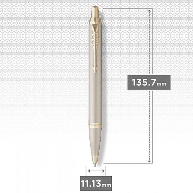 Колекція IM пропонує виняткові ручки для роботи. Довговічний та стильний корпус конусоподібної форми виготовлено з латуні. Гравіювання з назвою бренду на кільці та затискач-стріла - впізнавані риси Parker. Трендовий матовий дизайн відображає модні тенденції. Приємно відчутний в руці дизайн, який підійде і чоловікам, і жінкам. Ідеальна ручка як для повсякденного письма, так і для особливих випадків.