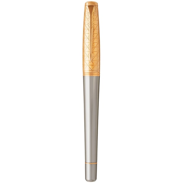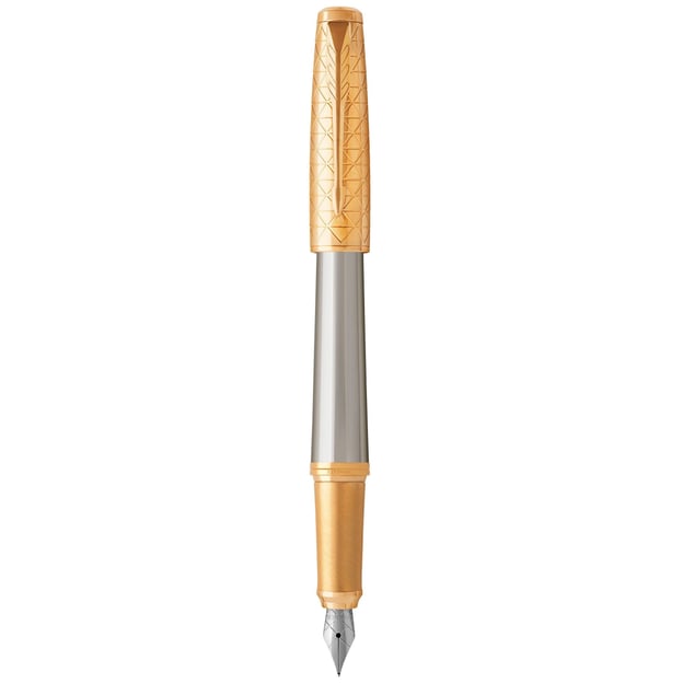 Parker URBAN Premium Aureate Powder GT FP F — преміальна перова ручка з тонким сталевим пером із колекції Урбан. Ця модель створена для тих, хто цінує якість, вишуканість і комфорт у кожній деталі. Аксесуар виконано із високоякісного металу в розкішному відтінку, підкреслюючим преміальний статус виробу. Алюмінієвий корпус сірого кольору з анодованим покриттям доповнений вишуканим графічним гравіюванням, нанесеним на знімний ковпачок із латуні. Елементи глянцевого золотистого оздоблення, включаючи кліпсу, кільце та наконечник, створюють гармонійне поєднання з основним кольором корпусу та додають ручці додатковий шарм. Перо розміру F гарантує точне, плавне й акуратне письмо, що робить цю ручку чудовим вибором для підписів, ділового листування або щоденного використання. Сумісна з картриджами для перових ручок або з конвертером для використання чорнила з флакона (купується окремо).