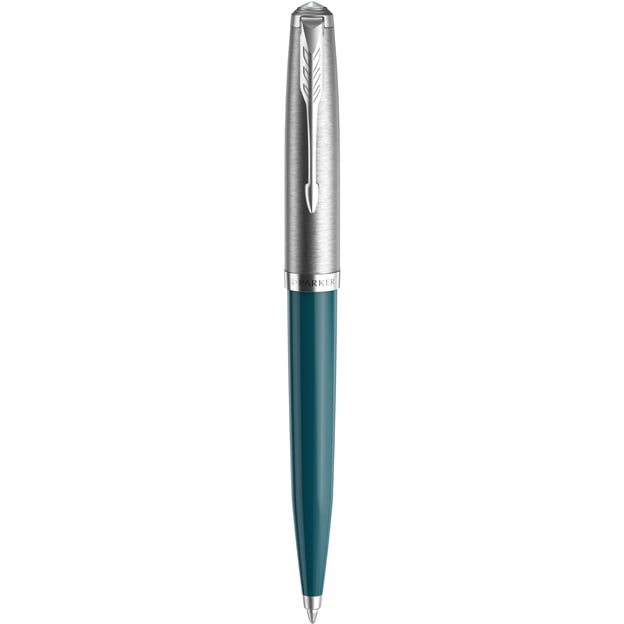 Parker PARKER 51 Teal Blue CT BP – стильна кулькова ручка в ретро дизайні. Це не просто інструмент для письма, а символ витонченого стилю, який ідеально підходить для роботи, навчання та творчості. Корпус ручки виконаний із акрилової смоли з глянцевим покриттям кольору морської хвилі, який гармонійно доповнюється сріблястим ковпачком з неіржавної сталі. Елементи оздоблення прикрашені паладієм, а торець ковпачка виділяється оригінальним огранюванням у вигляді металевого каменю. Кулькові ручки Parker 51 прості у використанні та догляді, завдяки продуманій конструкції та надійному механізму. Особливістю моделі є ковпачок із поворотною дією, який додає зручності та підкреслює унікальний стиль ручки. Змінні стрижні QuinkFlow забезпечують м'якість письма та рівномірну подачу чорнила.