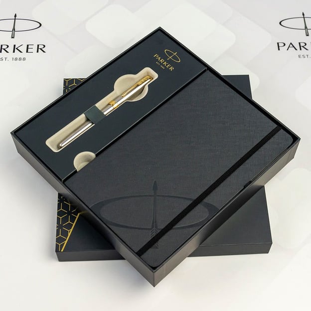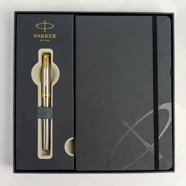 Елегантний набір Parker 84 111b24 з перовою ручкою SONNET Stainless Steel GT та блокнотом у подарунковій коробці. Сталевий дизайн, вишуканий вигляд якого підкреслює оздоблення високопробним натуральним золотом. Люксова колекція SONNET, яка є символом елегантності для чоловіків та жінок. Впізнаваний кліп-стріла Parker та вигравірувана назва бренду завершують бездоганний стиль ручки.