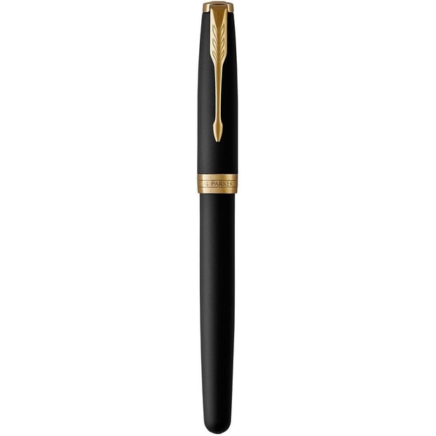 Ролерна ручка Parker SONNET Matte Black Lacquer GT у чорному матовому дизайні з оздобленням 24К золотом.