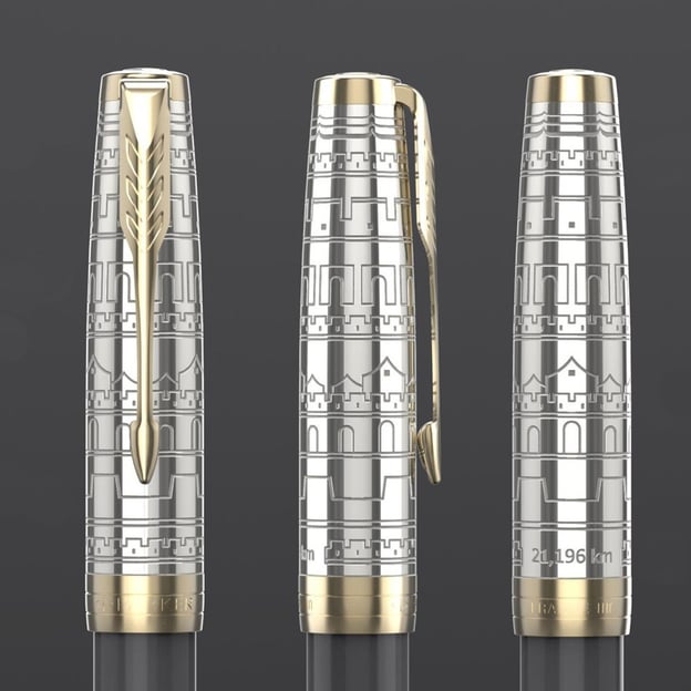 Parker SONNET Special Edition Ancient China Edition GT BP - колекційна кулькова ручка з унікальним срібним ковпачком, натхненним Великою Китайською стіною. Низькі лінії дахів, що символізують перевал Цзяюй на західному кінці стіни, доповнено виразними вежами і арками, що відображають захопливу архітектуру ділянки стіни Бадалін - найбільш відвідуваний туристами відрізок Великої Китайської стіни. Загальна довжина за результатами 2012 року становить 21 196 км, що також відображено у вигляді гравіювання на ковпачку.
