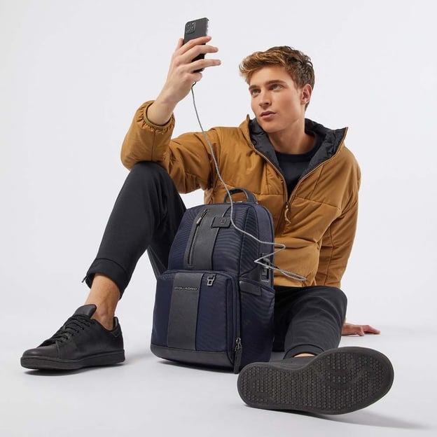 Piquadro BAGMOTIC (BM) Blue CA3214BR2BM_BLU - міський рюкзак, ідеально підходить для ділових людей і активних мандрівників. Модель, виконана в стильному синьому кольорі, привертає увагу своєю універсальністю і сучасним дизайном. Створений з перероблених матеріалів з елементами із натуральної шкіри, рюкзак вирізняється високою якістю і преміальною фурнітурою. Регульовані лямки рюкзака дають змогу легко адаптувати його під ваші потреби, а вентильована спинка забезпечує комфорт навіть у спекотну погоду або в разі тривалого носіння.