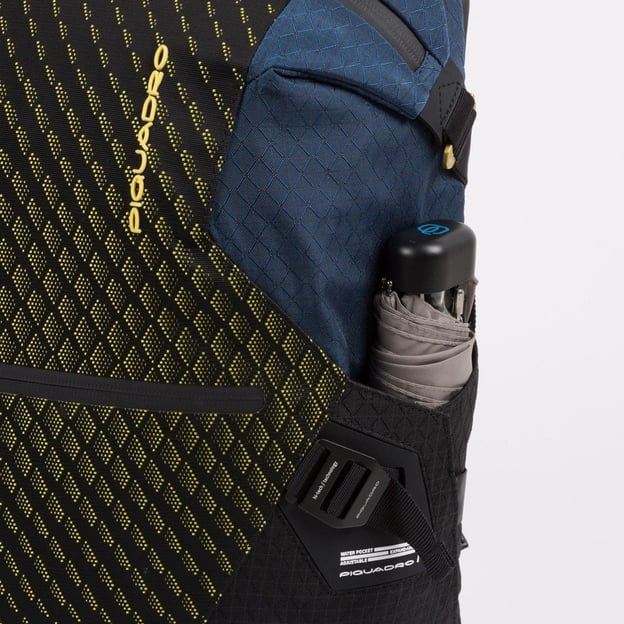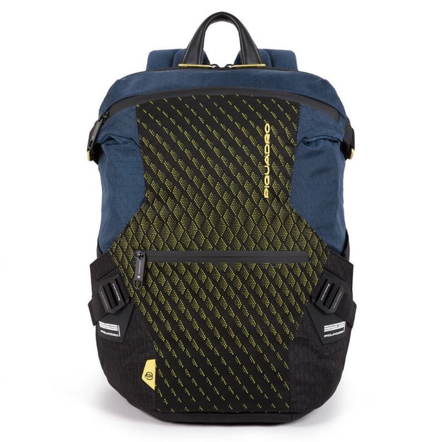 Piquadro PQ-Y (PQY) Blue-Yellow CA5116PQY_BLG - рюкзак з відділенням для ноутбука і планшета місткістю 17 літрів. Виготовлений з міцних і водонепроникних матеріалів, рюкзак стійкий до розривів і екстремальних умов. Він не розтягується, не пропускає воду і не вигоряє на сонці. Передня частина виробу виконана з жакардової тканини з об'ємним малюнком, бічні грані - з легкого поліаміду і волокна, використовуваного у військовій сфері, а нижню основу виготовлено з матеріалу, стійкого до стирання.