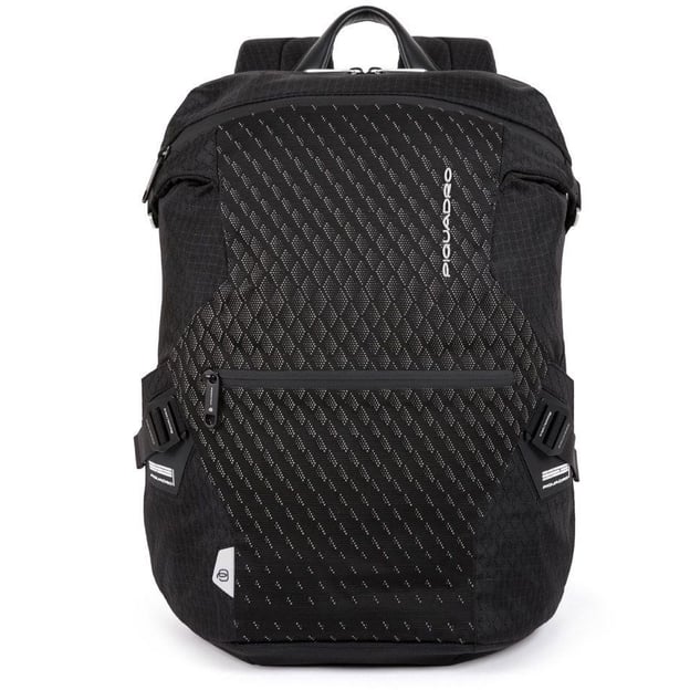 Piquadro PQ-Y (PQY) Black CA5116PQY_N - місткий 17-літровий рюкзак поєднує в собі функціональність, міцність і сучасний дизайн, що робить його ідеальним вибором для активних людей, які цінують надійність і стиль. Виготовлений з міцних і водонепроникних матеріалів, які стійкі до розривів, не розтягуються і не пропускають воду, гарантуючи довгий термін служби. Передня частина рюкзака виконана з жакардової тканини з об'ємним малюнком. Бічні панелі виготовлені з легкого поліаміду і волокна, використовуваного у військовій промисловості, забезпечуючи додаткову міцність і стійкість до порізів. Нижня частина зроблена з матеріалу, який застосовується для виготовлення технічного одягу, що робить цю модель максимально стійкою до стирання.
