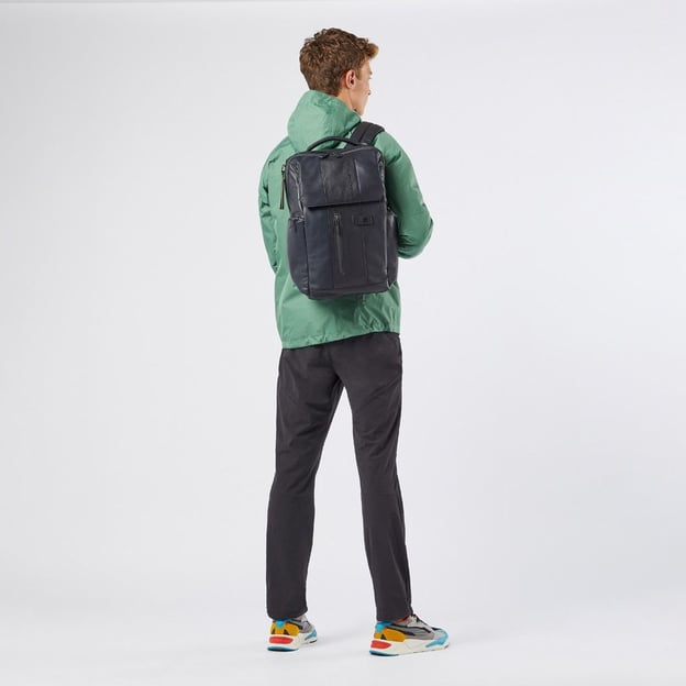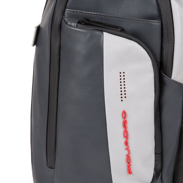 У головному відділенні передбачено вбудований органайзер із протиударною кишенею для ноутбука до 15,6 дюймів і iPad Air/Pro. З фронтальної сторони розташована вертикальна кишеня на блискавці для дрібниць, а також відділення з магнітними кнопками та блискавкою, що включає сітчасту кишеню для маски та пластиковий пакет для її зберігання. Бічні кишені додають зручності: одна оснащена маленьким відсіком для фірмового трекера Piquadro, інша чудово підходить для невеликої парасольки або пляшки з водою.