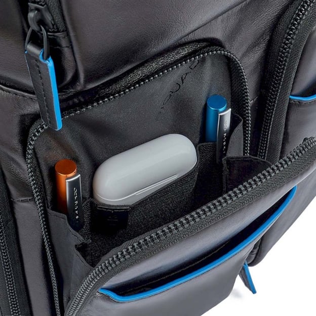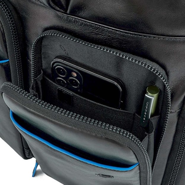 Piquadro B2 REVAMP(B2V) Black CA5573B2V_N - великий шкіряний рюкзак з відділенням для ноутбука і планшета, RFID-захистом і дощовиком. Функціональна і стильна модель виконана в класичному чорному кольорі з контрастною обробкою блакитним кантом. Така модель підійде для ділових людей, студентів, мандрівників і всіх, хто цінує якість і сучасний дизайн.