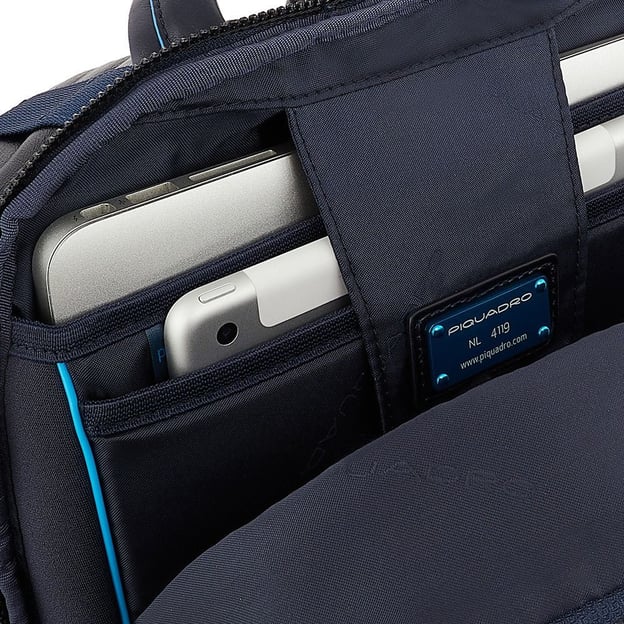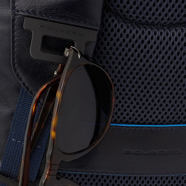 Чорний рюкзак Piquadro B2 REVAMP(B2V) Black CA5574B2V_N із натуральної шкіри з блакитним кантом, ідеальний варіант для роботи, навчання і відряджень. Зручна спинка з системою вентиляції та регульовані наплічні ремені гарантують комфорт під час тривалого носіння, без дискомфорту на плечі або спину.