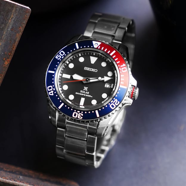 - Синьо-червоний односпрямовано обертовий безель з дайверською розміткою.
