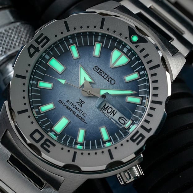Seiko SRPG57K1 Special Edition - дайверський автоматичний годинник Prospex Monster 42 мм з лапками пінгвіна на циферблаті та запасом ходу до 41 години. Спеціальний випуск Save The Ocean, який натхненний захистом пінгвінів в Антарктиці, як видно на циферблаті. Ця версія 2021 року оснащена сталевим браслетом та розроблена для екстремальних водних видів спорту завдяки водонепроникності до 200 метрів. Циферблат полярно-синього кольору з великими мітками зі світлонакопичувальним покриттям LumiBrite (власний запатентований склад Seiko) покращують читаність при слабкому освітленні та його відсутності.