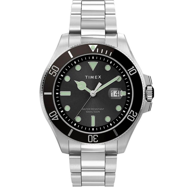 Виробник Timex поєднав сріблястий корпус діаметром 43 мм і чорний циферблат зі сталевим браслетом в єдиний концепт міцного годинника.