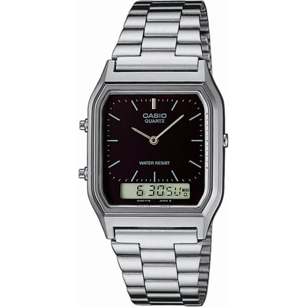 Годинник із серії CASIO AQ 230 – це акуратний прямокутний корпус з подвійним видом індикації: зі звичними стрілками та цифровим багатозадачним дисплеєм. Модель Casio VINTAGE EDGY AQ-230A-1DMQYES зі сталевим браслетом срібного кольору та крутим чорним циферблатом органічно виглядає на чоловікові та жінці, а рухливий тип розкладного замка дозволить швидко відрегулювати довжину браслета під ваш зап'ясток. Надійний, міцний і елегантний: браслет з неіржавної сталі надає вашому годиннику класичного вигляду.