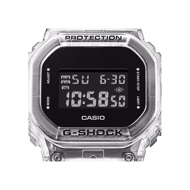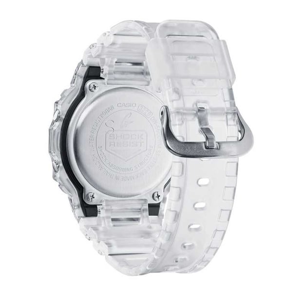 Casio G-SHOCK DW-5600SKE-7ER — чоловічий цифровий годинник із посиленим водозахистом 20 ATM / 200 м. Кварцовий механізм і електронна індикація роблять його простим у щоденному користуванні, а квадратний корпус у прозорому виконанні з чорним дисплеєм виглядає стримано й сучасно.