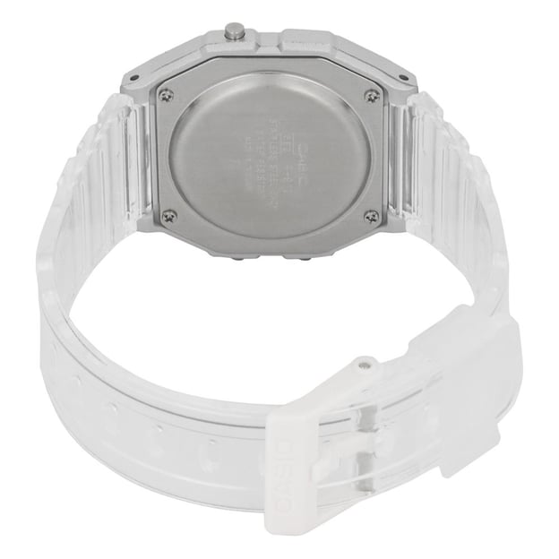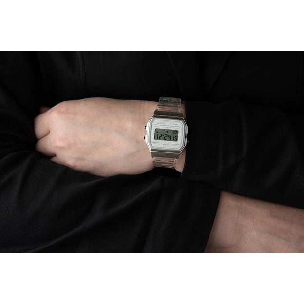 Casio STANDARD Digital F-91WS-7EF — компактний жіночий цифровий годинник у квадратному полімерному корпусі в сріблястому відтінку. Прозорий полімерний ремінець і легкі матеріали роблять модель зручною для щоденного носіння, а акрилове скло підходить для активного ритму життя.