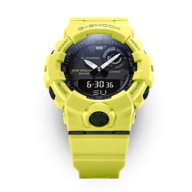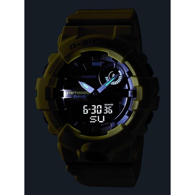 Casio G-SHOCK GBA-800-9AER — чоловічий годинник із посиленим водозахистом 20 ATM (200 м), розрахований на активне щоденне носіння. Аналого-цифрова індикація допомагає швидко зчитувати час, а підсвічування виручає у темряві. Полімерний корпус і полімерний ремінець практичні та легкі, а мінеральне скло добре підходить для повсякденних навантажень.