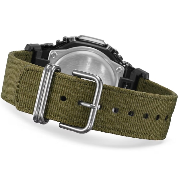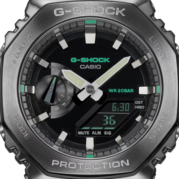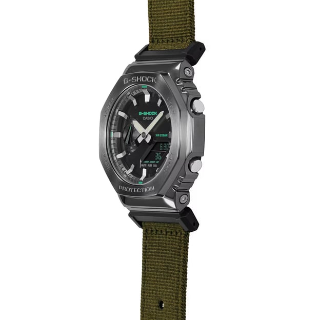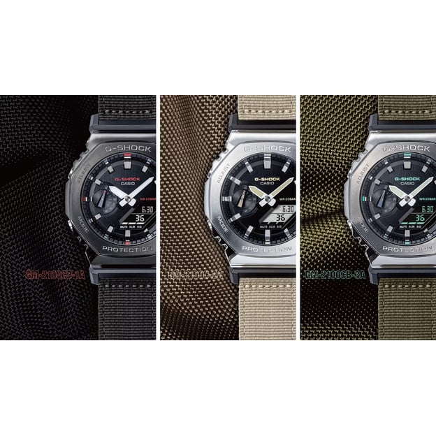 Casio G-SHOCK GM-2100CB-3AER — чоловічий аналого-цифровий годинник з круглим корпусом у стриманому сірому кольорі та чорним циферблатом. Поєднання неіржавної сталі й полімеру робить модель практичною для щоденного носіння, а текстильний зелений ремінець додає легкості на руці.