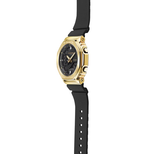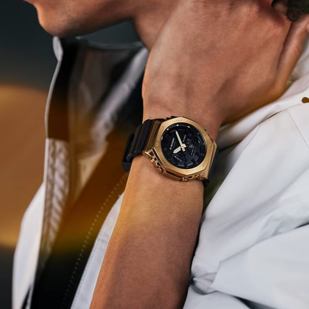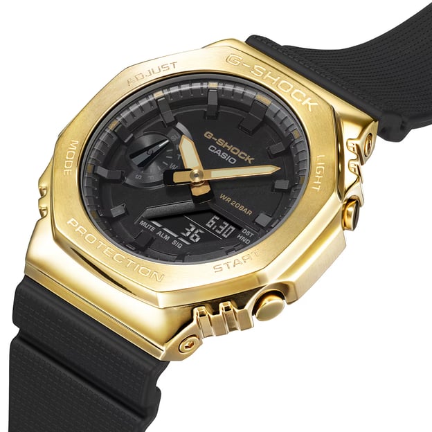 Casio G-SHOCK GM-2100G-1A9ER — чоловічий годинник з посиленим водозахистом, у якому поєднані круглий корпус з металевими акцентами та фірмова витривалість серії. Золотистий корпус контрастує з чорним циферблатом і чорним полімерним ремінцем, а мінеральне скло підходить для щоденного носіння. Аналого-цифровий формат дозволяє зчитувати час як за стрілками, так і на дисплеї.