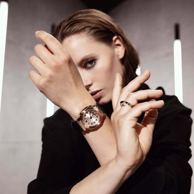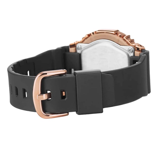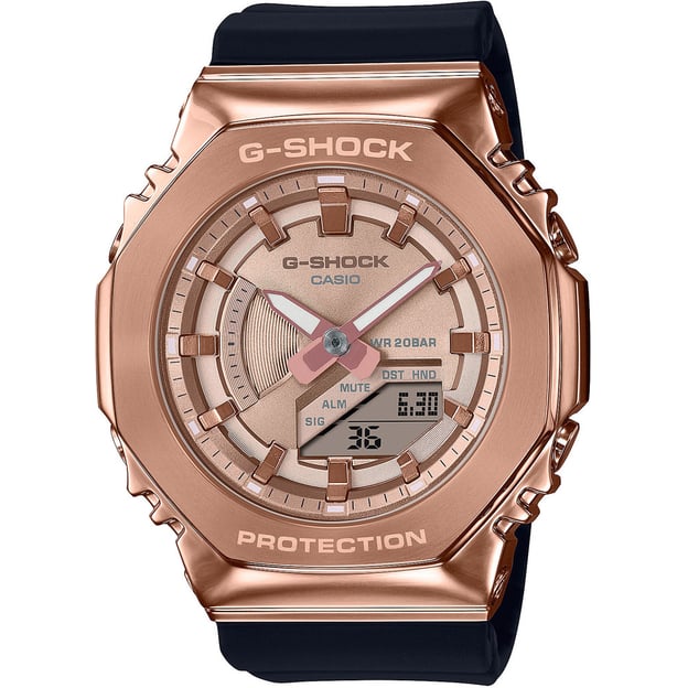 Casio G-SHOCK GM-S2100PG-1A4ER — жіночий аналого-цифровий годинник із посиленим водозахистом 20 ATM (200 м). Корпус у відтінку рожевого золота поєднаний із чорним полімерним ремінцем, а циферблат у тоні рожевого золота додає моделі акуратного, лаконічного стилю. Мінеральне скло добре підходить для щоденного носіння.