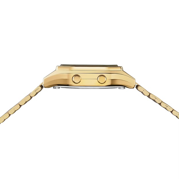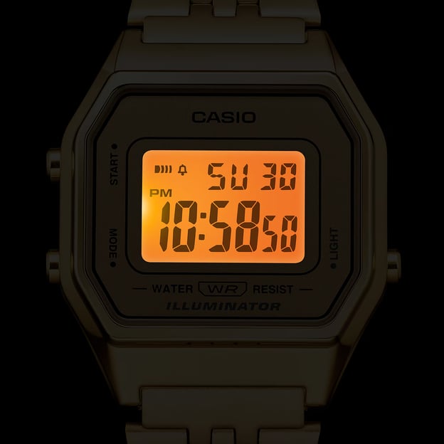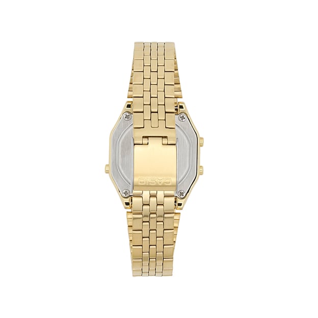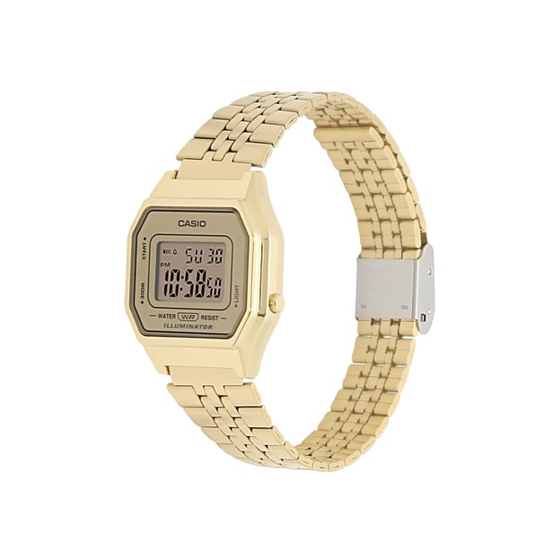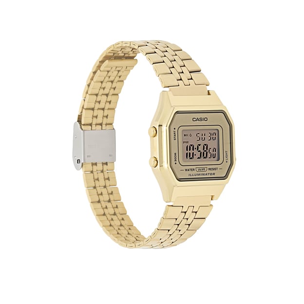 Casio STANDARD Digital LA680WGA-9 — жіночий цифровий годинник у золотистому виконанні з квадратним корпусом. Полімерний корпус легкий у щоденному носінні, а браслет із неіржавної сталі додає відчуття надійності. Золотистий циферблат і компактний діаметр 28 мм роблять модель акуратною та помітною без зайвої масивності.
