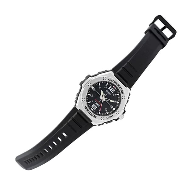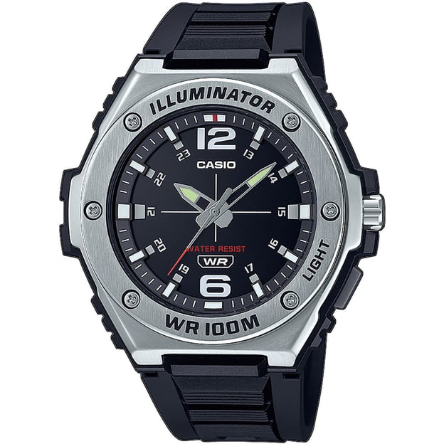Casio STANDARD Analogue MWA-100H-1AVEF — практичний чоловічий годинник з підвищеним водозахистом. Круглий корпус у сріблястому кольорі поєднує неіржавну сталь і полімер, а чорний циферблат добре читається у повсякденному використанні. Модель працює на кварцовому механізмі та має аналогову індикацію.