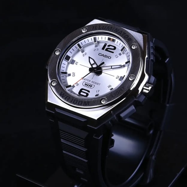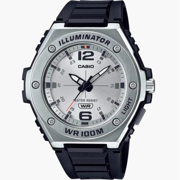 Casio STANDARD Analogue MWA-100H-7A — практичний чоловічий годинник з підвищеним водозахистом. Круглий корпус у сріблястому кольорі поєднується зі сріблястим циферблатом, а чорний полімерний ремінець додає контрасту та робить модель легкою на руці. Аналогова індикація звично читається, без зайвих деталей.