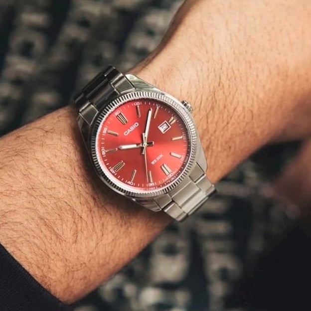 Японський чоловічий годинник Casio MTP-1302PD-4AVEF з браслетом із неіржавної сталі та червоним циферблатом. Ефектна кварцова модель, яка, крім часу, показує також дату.