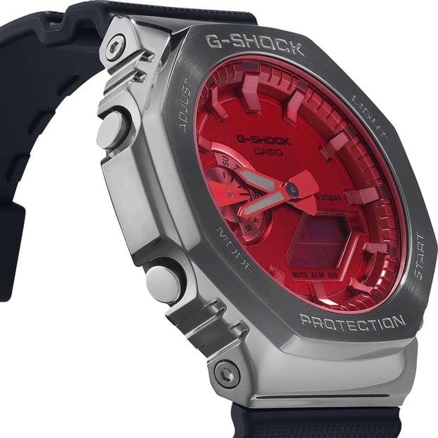 Спортивний японський годинник Casio GM-2100B-4AER з лінійки G-Steel. Обожнюваний вами і нами G-SHOCK, який поєднує стиль, комфорт та функціональність. Повсякденний дизайн відрізняється ретельно деталізованим металевим зовнішнім виглядом та сучасною естетикою чорного та червоного. Металева восьмикутна форма безеля віддає данину класичному стилю, представленому в перших G-SHOCK - DW-5000, що дебютували в 1983 році. Модель має водонепроникність 200 метрів та ідеально підходить для занять водними видами спорту. Годинник оснащений японським кварцовим механізмом, який забезпечує точність вимірювання часу. Містить безліч функцій, які підвищують вашу продуктивність у різних повсякденних справах.