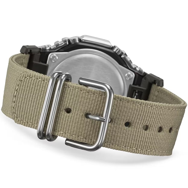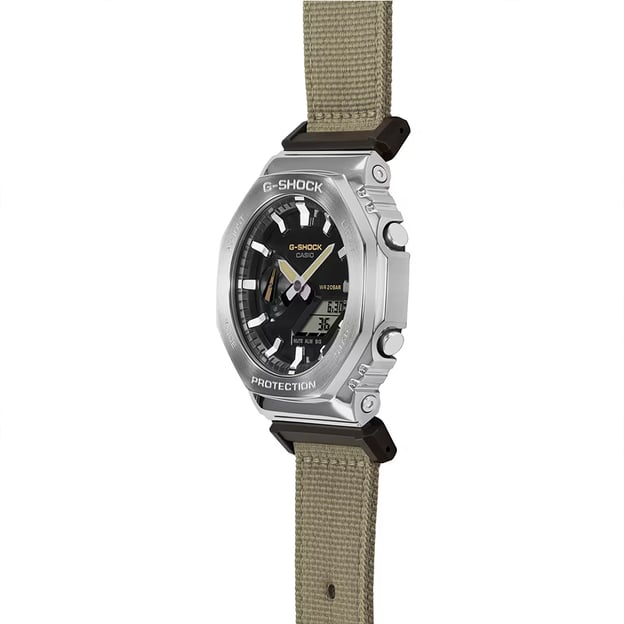 Удароміцний і водонепроникний японський годинник Casio G-SHOCK зі сталевим безелем і нейлоновим ремінцем пісочного кольору. Крутий та мультифункціональний циферблат з комбінованою індикацією та підсвічуванням. Додайте практичності у свій стиль за допомогою G-SHOCK з лінійки Utility Metal. Цей інноваційний годинник поєднує культову восьмикутну форму корпуса, полірований безель і металевий дизайн з міцним текстильним ремінцем. Контрастне поєднання металу та тканини створює суворий стиль, не позбавлений повсякденної вишуканості. Модель GM-2100 має водонепроникність 200 метрів та ідеально підходить для занять водними видами спорту. Годинник оснащений японським кварцовим механізмом, який забезпечує точність вимірювання часу. Містить безліч функцій, які підвищують вашу продуктивність у різних повсякденних справах.