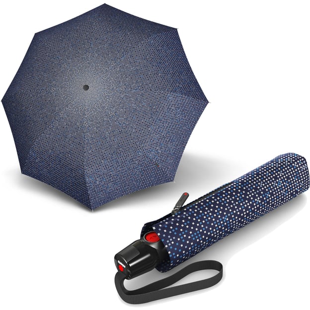 Knirps T.200 Medium Duomatic (Nuno Spray/темно-синя з геометричним малюнком) - німецька автоматична парасолька в темно-синьому кольорі із серії T.200 від Knirps. Неординарний дизайн та висока німецька якість. Складана парасолька з функцією Duomatic - відкривання і складання купола одним натисканням червоної кнопки. Купол комфортного розміру 98 см, який виготовлений з поліестеру, він міцний та зносостійкий. Міцна та одночасно гнучка конструкція спиць захистить цілісність конструкції під час сильного вітру, навіть якщо купол парасольки викрутиться навиворіт. Парасольки серії T.200 одні з найбільш вітростійких парасольок в асортименті Knirps і легко витримує швидкість вітру до 150 км/год. Зручна ручка доповнена ремінцем-петелькою та фірмовим логотипом Knirps.