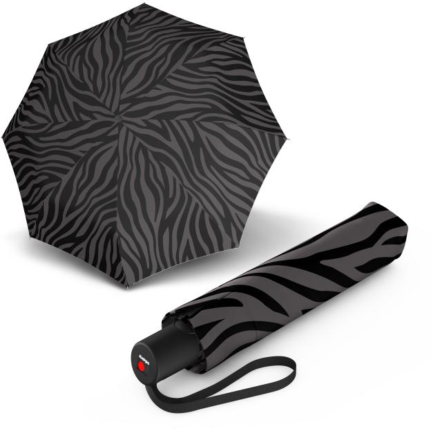 Knirps A.200 Medium Duomatic (Zebra Black/сіро-чорний малюнок зебри) - вітростійка складана парасолька-автомат з анімалістичним принтом. Універсальні принти колекції чудово підійдуть чоловікам та жінкам. Прекрасний захист від дощу з куполом середнього розміру 98 см. Купол виготовлений з водовідштовхувального поліестеру, який гарантує міцність та зносостійкість.