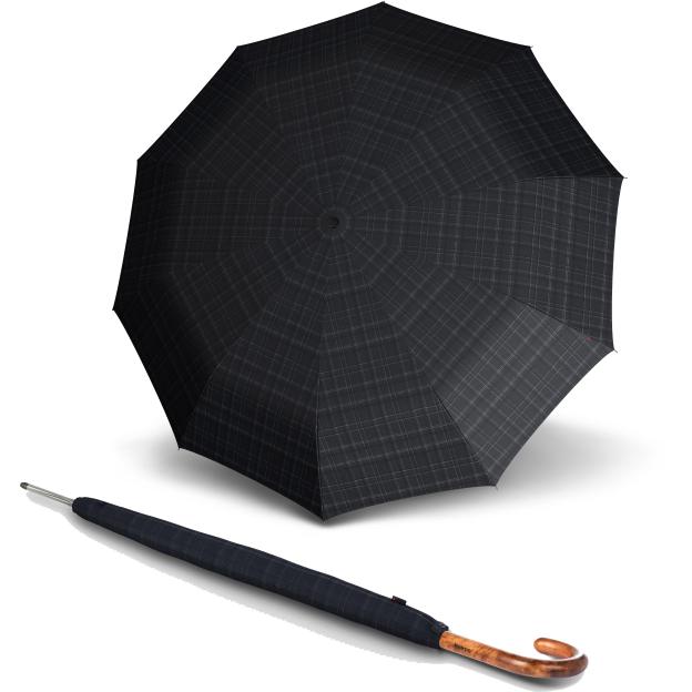 Knirps T.771 Long Automatic (Men's Prints Check/темно-графітова у клітинку) - елегантна чоловіча парасолька-тростина з дерев'яною ручкою гаком ручної роботи від Knirps. Великий купол для двох та елегантна кругла ручка-гак ручної роботи з натурального клена. Це робить кожну парасольку унікальною. Завдяки напівавтоматичному механізму, заходячи в приміщення або сідаючи в машину, ви плавно складете купол парасольки, не намочивши себе і навколишніх бризками дощу. Вітростійкий каркас захищає купол від вивертання. Міцний купол із поліестеру, який відштовхує вологу та бруд (має сертифікацію Oeko-Tex Standart 100). Щоб парасолькою можна було насолоджуватися якомога довше, в комплект входить захисний чохол, який запобігає пошкодженню і забрудненню.