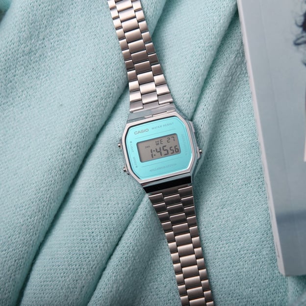 Casio STANDARD Digital A168WEM-2EF — жіночий цифровий годинник у впізнаваному квадратному корпусі. Блакитний електронний циферблат добре читається, а акрилове скло та полімерний корпус роблять модель комфортною та практичною для щоденного носіння.