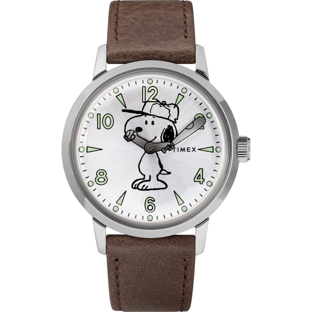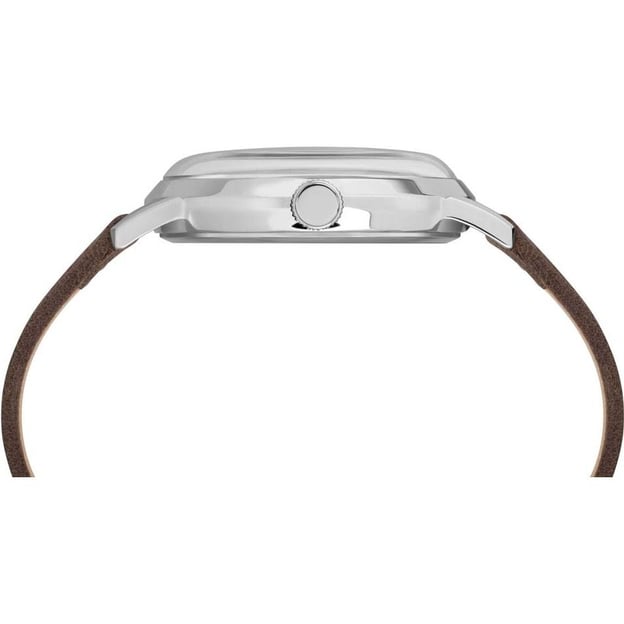 Акрилове скло робить модель легкою для щоденного носіння, а коричневий шкіряний ремінець додає комфорту на зап’ясті. Розмір корпуса 40 мм і ширина ремінця 20 мм — збалансовані для більшості чоловічих рук. Водозахист 3 ATM (30 м) підходить для повсякденних ситуацій на кшталт бризок і дощу.