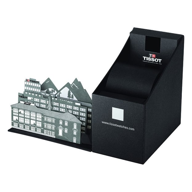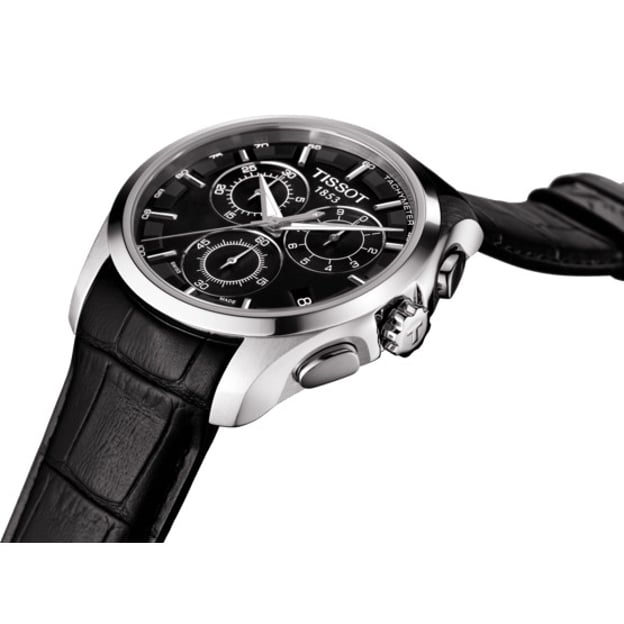 Tissot COUTURIER T035.617.16.051.00 - швейцарський кварцовий годинник зі сталевим корпусом 41 мм, чорним циферблатом і функцією хронографа. На циферблаті розташовані три додаткові лічильники - 30-хвилинний, 1/10 секунди і центральна 60-секундна стрілка хронографа. Крім того, модель оснащена тахіметричною шкалою, покажчиком дати в положенні «4 години». Модель відрізняється вінтажним класичним дизайном, який проявляється в таких деталях, як гільйошований візерунок і вигнутий корпус в стилі 1950-х років. Підходить як для повсякденного носіння, так і для активного відпочинку: плавання, прогулянки, поїздки, де потрібен захист від води до 100 метрів.