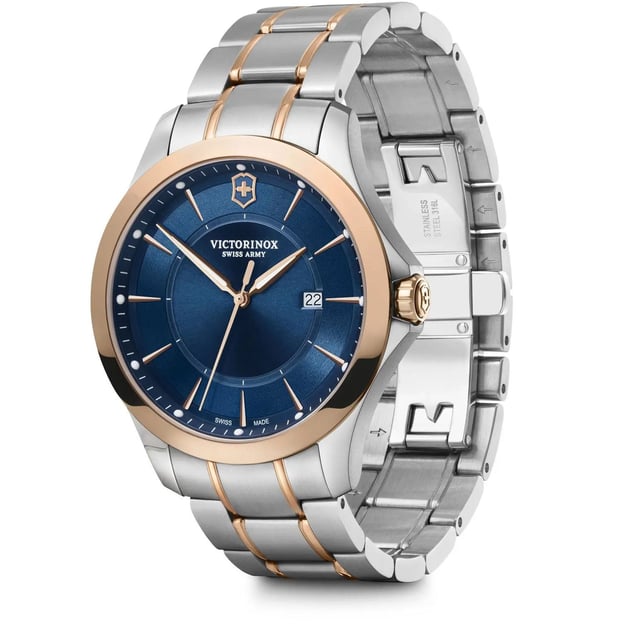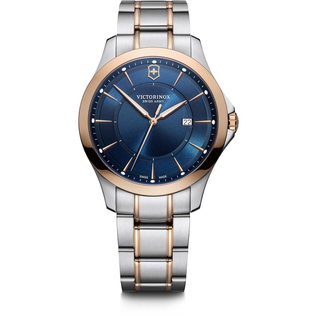Victorinox Swiss Army Alliance 241911 — годинник 40 мм, у якому синій циферблат і двоколірний браслет створюють виразний, але зручний щоденний формат. Поєднання сталі та рожевого золота додає моделі характеру, а металевий браслет забезпечує міцність і комфортну посадку на руці.