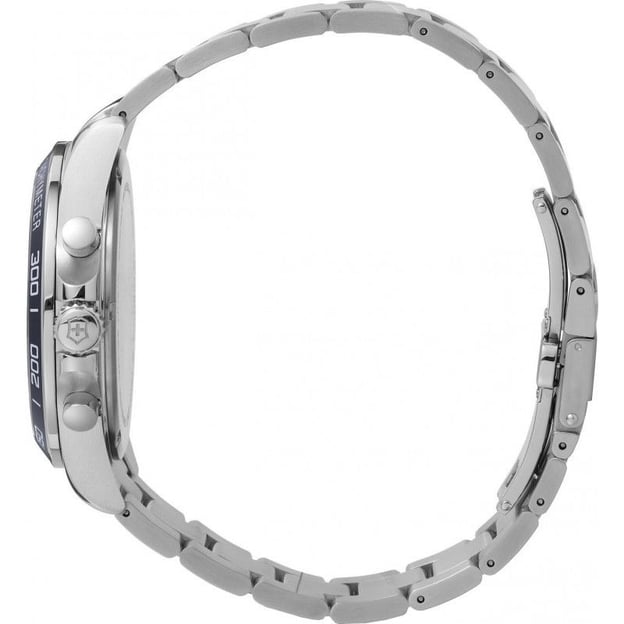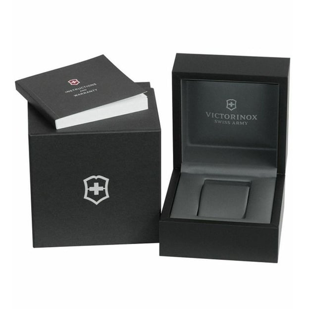 На синьому циферблаті розмістилися великі цифри, контрастні стрілки та яскравий логотип преміального бренду Victorinox Swiss Army.