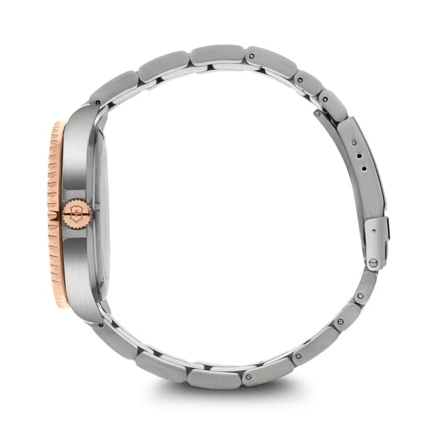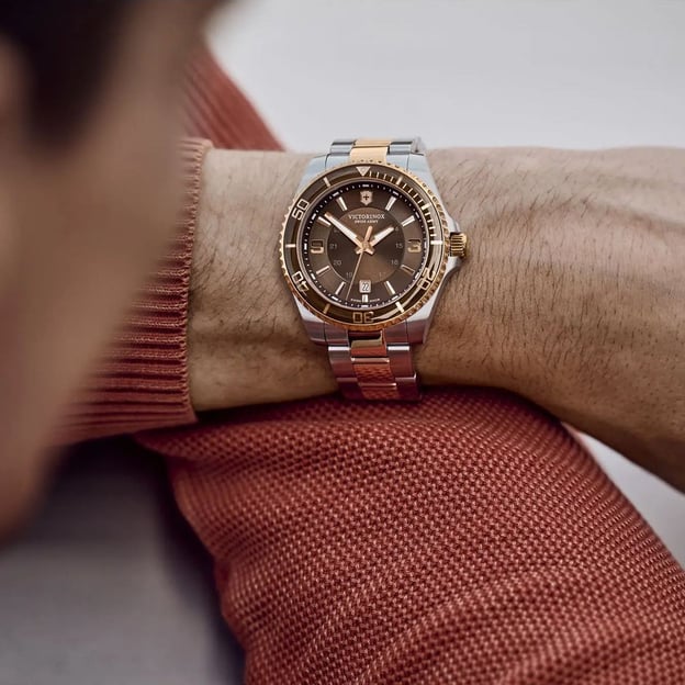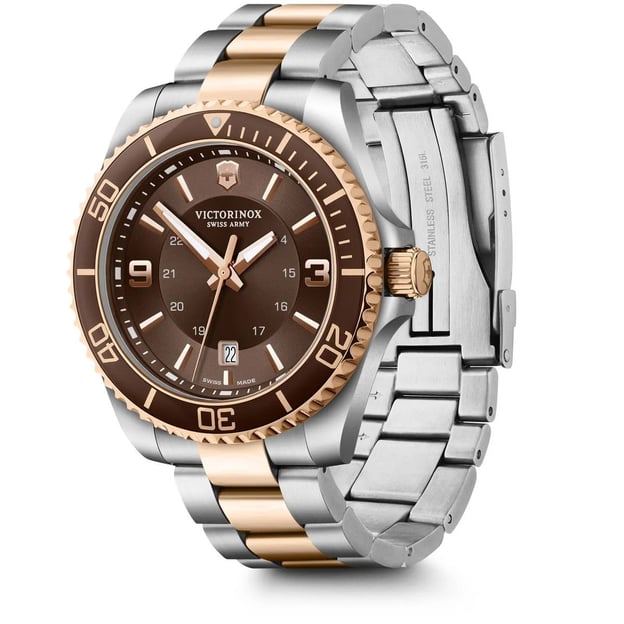 Victorinox Swiss Army V241951 - кварцовий годинник MAVERICK Large 43 мм з коричневим циферблатом і двоколірним сталевим браслетом. Елегантне та благородне поєднання кольорів. Швейцарський механізм, що став втіленням надійності та точності. Досить великий корпус з високоякісної сталі, функція дати, світлонакопичувальна індикація Super-LumiNova®, мужній браслет і безліч деталей, які відсилають нас до стилю дайверських годинників: від безеля, що обертається, до застібки з подвійним блокуванням. А великий термін гарантії говорить про впевненість бренду у високій якості своїх годинників.