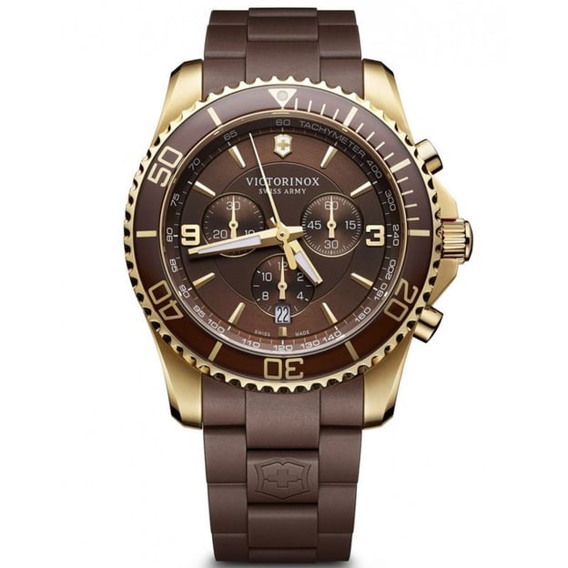 Victorinox MAVERICK Chrono V241692 - кварцовий годинник у золотисто-коричневому дизайні з хронографом, датою та тахіметром. Цей водонепроникний годинник залишається вірним морській стихії: має спортивний силует в стилі дайверських годинників, чудово адаптується до повсякденних викликів. Мужній розмір сталевого корпусу та високий рівень водозахисту, з яким ви можете спокійно проводити дозвілля біля води. Точний швейцарський механізм із функцією хронографа. Швидке управління хронографом покладено на дві кнопки на корпусі: верхня - запуск/стоп стрілки хронографа; нижня – скидання значень.