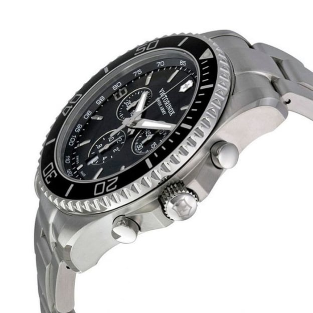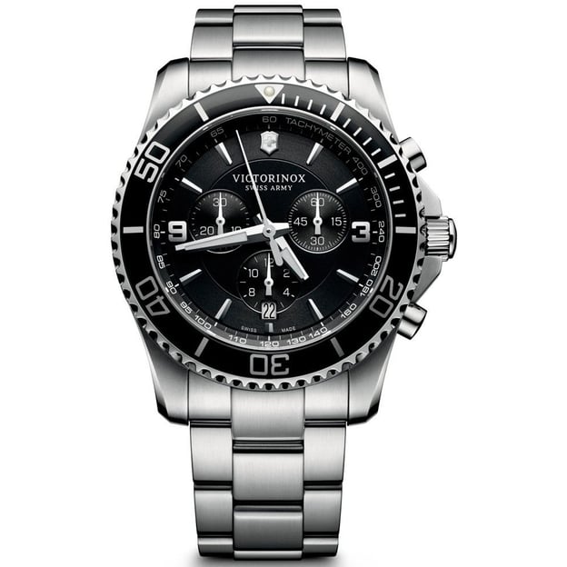 Victorinox MAVERICK Chrono V241695 - сталевий кварцовий годинник-хронограф 43 мм з чорним циферблатом та браслетом. Цей водонепроникний годинник з хронографом, датою і тахіметром залишається вірним морській стихії: має спортивний силует в стилі дайверських годинників, чудово адаптується до повсякденних викликів. Мужній браслет, досить великий діаметр сталевого корпусу та високий рівень водозахисту, з яким ви можете спокійно проводити дозвілля біля води. Точний швейцарський механізм із функцією хронографа. Швидке управління хронографом покладено на дві кнопки на корпусі: верхня - запуск/стоп стрілки хронографа; нижня – скидання значень.