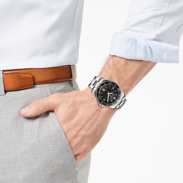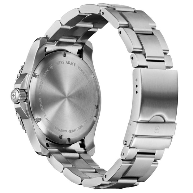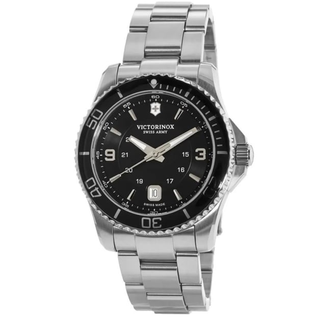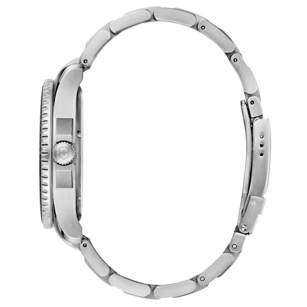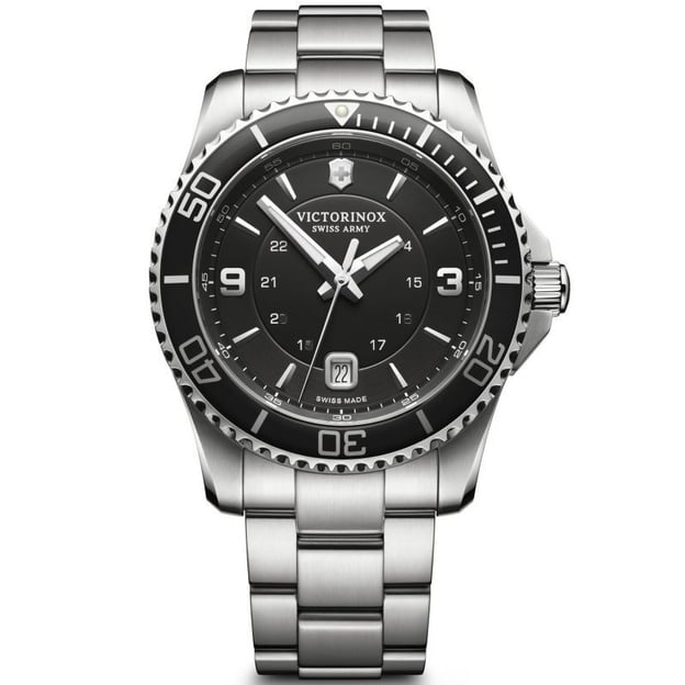 Victorinox Swiss Army V241697 - чоловічий кварцовий годинник MAVERICK Large 43 мм з чорним циферблатом і сталевим браслетом. Швейцарський механізм, що став втіленням надійності та точності. Досить великий корпус з високоякісної сталі, функція дати, світлонакопичувальна індикація Super-LumiNova®, мужній браслет і безліч деталей, які відсилають нас до стилю дайверських годинників: від безеля, що обертається, до застібки з подвійним блокуванням. А великий термін гарантії говорить про впевненість бренду у високій якості своїх годинників.