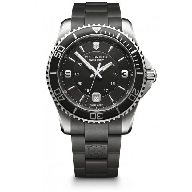 Victorinox V241698 - кварцовий водонепроникний годинник MAVERICK Large на чорному каучуковому ремінці. Спортивний силует для адептів динамічного способу життя. Швейцарський механізм, який став втіленням надійності та точності. Досить великий корпус діаметром 43 мм з високоякісної сталі, функція дати, світлонакопичувальна індикація Super-LumiNova®, зручний ремінець і деталі, які відсилають нас до стилю дайверських годинників: від безеля, що обертається, до високого класу водозахисту 10 АТМ. А великий термін гарантії говорить про впевненість бренду у високій якості своїх годинників.