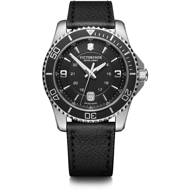 Victorinox V241862 - кварцовий годинник MAVERICK Large з чорним шкіряним ремінцем та водонепроникністю 10 АТМ. Швейцарський механізм, який став втіленням надійності та точності. Досить великий корпус діаметром 43 мм з високоякісної сталі, функція дати, світлонакопичувальна індикація Super-LumiNova®, класичний ремінець і деталі, які відсилають нас до стилю дайверських годинників: від безеля, що обертається, до високого класу водозахисту. А великий термін гарантії говорить про впевненість бренду у високій якості своїх годинників.