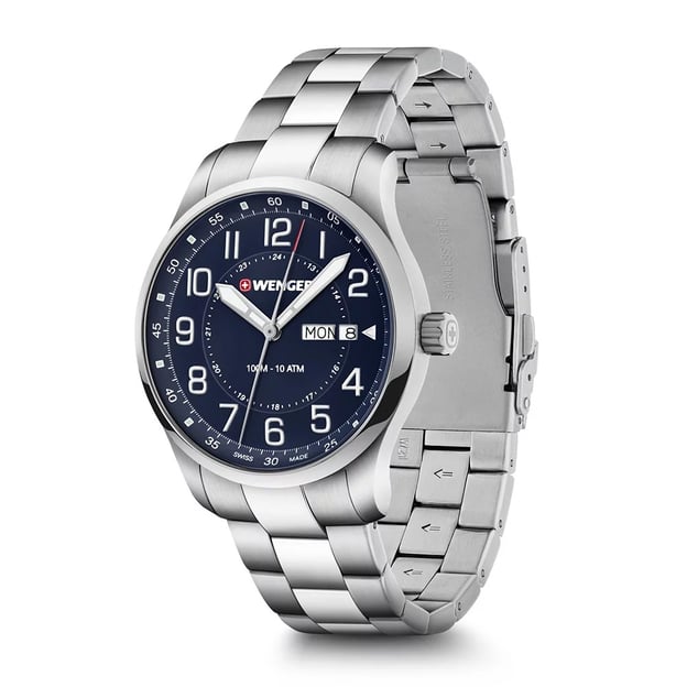 Годинник оснащений точним кварцовим механізмом, індикацією дня тижня та дати, а також люмінесцентними стрілками для читання часу в умовах низького освітлення. Темно-синій циферблат із контрастною хвилинною розміткою та великими арабськими цифрами забезпечує високу читаність часу. Водозахист до 10 АТМ дозволяє не знімати годинник під час водних активностей, але не підходить для дайвінгу. Завдяки задній кришці з конструкцією, що загвинчується, годинник має додаткову герметичність. Якість швейцарського бренду Wenger підтверджено знаком Swiss Made, що гарантує дотримання високих стандартів.